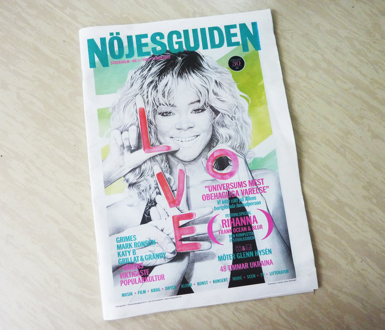 For the early summer issue of Nöjesguiden I created this detailed portrait of Rihanna who was headlining the "Peace and Love" festival in Sweden that year.
